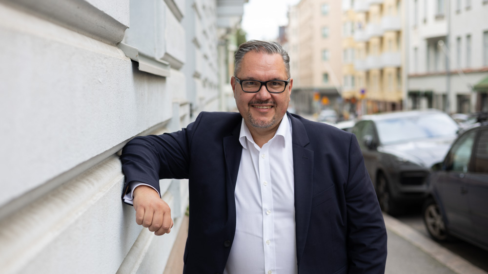 Silmälasipäinen mies katsoo hymyillen kameraan.